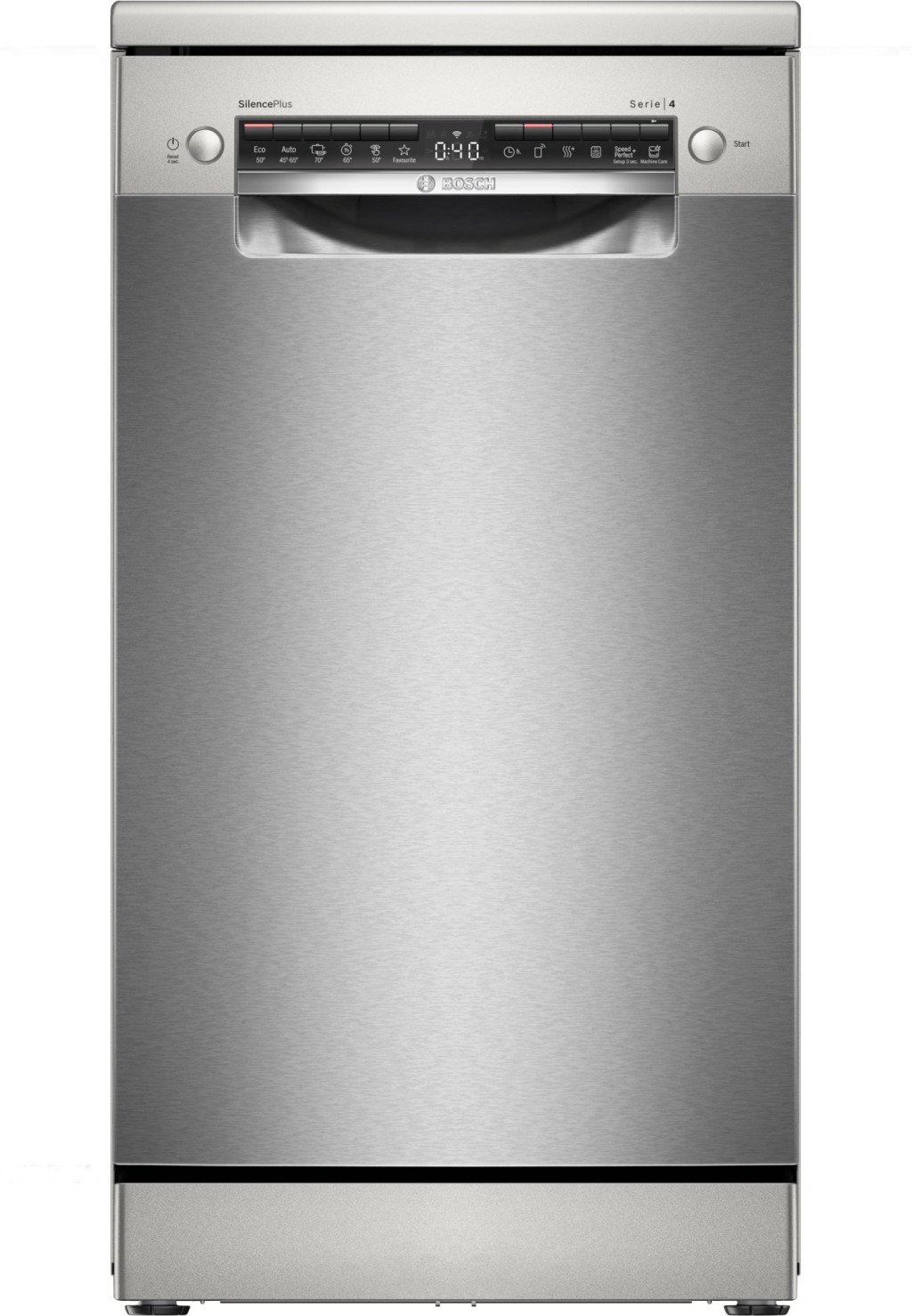 Szabadonálló mosogatógép - Serie4 - Home Connect - Nemesacél - 10 teríték - Energiaosztály:E - 6 program - 4 opció - Nagyméretű LED kijelző - Nyomógombos vezérlés - Hőcserélős kondenzációs szárítás - VarioFlex kosárrendszer - VarioDrawer - 9,5 liter/ciklus - 44 dB(A) re 1 pW - Programok: Eco 50°C, Auto 45-65°C, Intenzív 70°C, 1 h 65°C, Silence 50°C, Favourite/Előöblítés - Opciók: Időzítés (24h), Extra szárítás, IntenzívZóna, SpeedPerfect +, MachineCare, További opciók a HC alkalmazásban - Kijelzés: Só és öblítőszer- hiány, Maradék-idő - Felszereltség: AquaStop, EcoSilence Drive , AquaSensor, Töltöttség szenzor, Háromszoros szűrő rendszer, Regeneráló elektronika, Üvegvédelmi rendszer, DosageAssist, Elektronikus nyomógombzár - Kosárrendszer: Váltókar technika, Állítható felső kosár (Rackmatic), Lehajtható elemek az alsó kosárban (2db), Lehajtható elemek a felső kosárban (2db), Lehajtható pohártartó az alsó kosárban (1db), Lehajtható pohártartó a felső kosárban (1db), Kosármegállító ütközők, Alacsony súrlódású kerekek az alsó kosárban, Alacsony súrlódású kihúzórendszer a felső kosárban - Méretek (mm, ma x szé x mé):845x450x600 - Állítható lábak(mm): max. 20